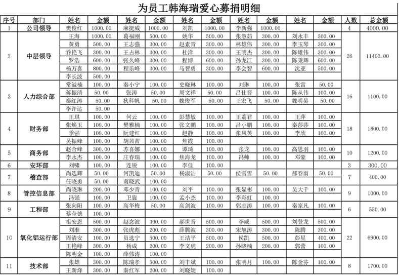 月5日,公司工会发出了为韩海瑞同志进行爱心募捐的倡议书,倡议一经发出,公司领导带头捐款,广大员工积极响应、踊跃捐款,一时间,在公司内形成了一片“爱的海洋”,短短3天时间,共收到员工爱心捐款62765元,彰显了复晟人“一方有难,八方支援”的伟大善举,以实际行动表达了对韩海瑞的爱心及关怀。